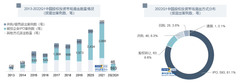 这个变化堪称震撼。须知道长久以来,IPO都是中国VC/PE一直依赖的主要退出方式。清科研究中心数据也告诉我们,2022年一季度中国股权投资市场共发生731笔退出案例,其中被投企业IPO仍为主要退出方式,数量达593笔占比超8成。