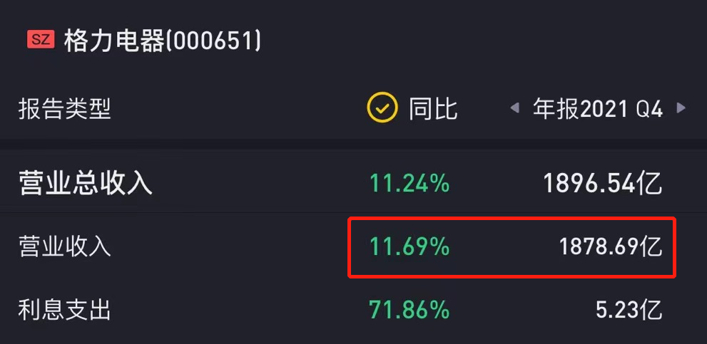 2021年全年,格力总营收为1878.69亿元,约等于美的营收规模的二分之一,同比增长了11.69%。