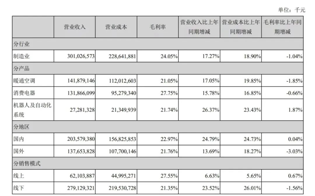 净利润增速和毛利率,已经暴露了美的软肋。美的年报显示,其2021年整体制造业务毛利率是24.05%,同比减少了1.04%,而2019年的毛利率是30.55%。也就是说,从疫情开始后,美的整体毛利率连续两年出现下滑。