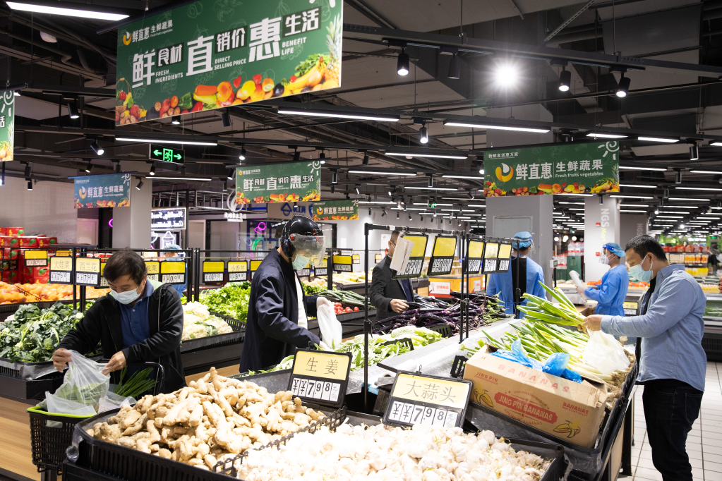住在附近的居民李佳在这家超市选购了调味料和新鲜蔬果。李佳说,这是疫情后自己第一次出门到线下实体店购物,相比小区团购的选择有限、物流不稳定,超市门店不仅产品丰富新鲜,价格也更亲民。“线下逛超市的感觉还是不一样,看到绿油油的青菜,感觉自己的信心慢慢在恢复。”