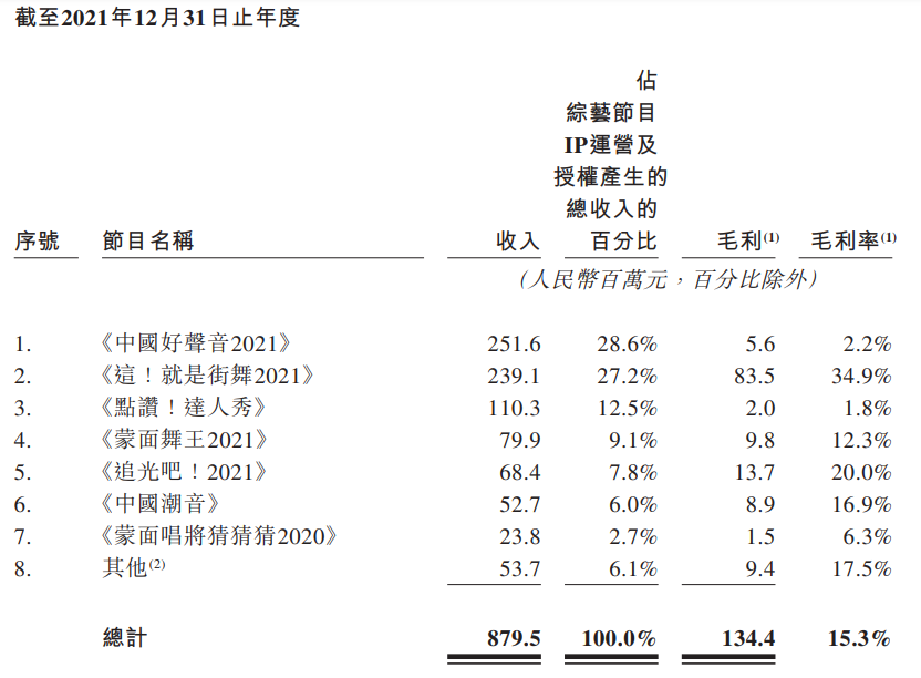 根据弗若斯特沙利文报告,按2020年收入计,公司是中国最大综艺节目IP创造商及运营商,市场份额为2.0%。2012年,公司推出中国最受欢迎的歌唱比赛节目之一《中国好声音》,播出十季后,创下中国季播持续时间最长的综艺节目纪录。