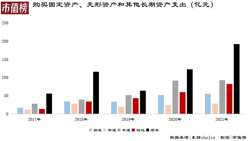 2020年,头部五家企业(三通一达和顺丰)资本开支超360亿,占总营收比重达13.4%。尤其是顺丰,2021年,顺丰资本性开支达192 亿元,同比增长56.5%。韵达和圆通也加大了对于转运中心的相关投入。
