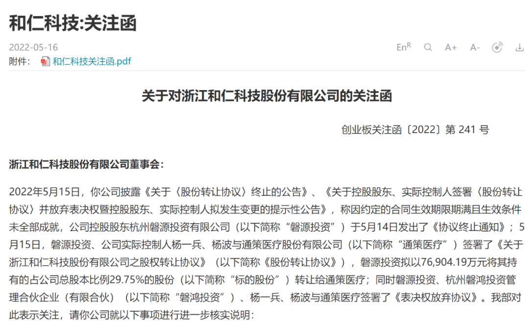 5月16日晚,深交所创业板公司管理部向和仁科技发出关注函,要求和仁科技说明通策医疗股权收购具体资金来源,明确自有资金比例,涉及外部融资的,要列示融资规模、资金来源、融资利率、期限及筹措进展。