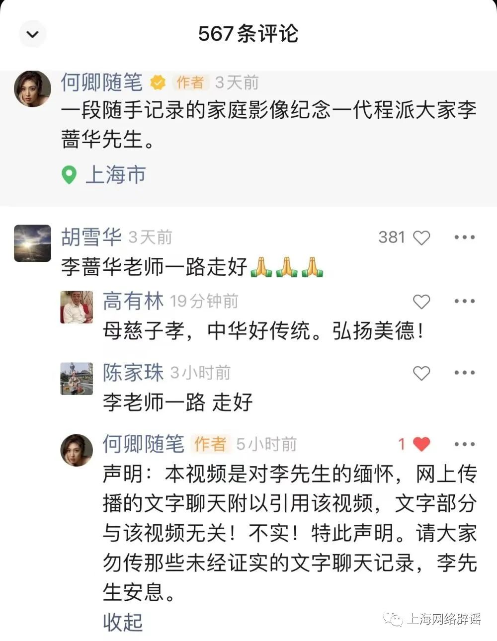 何卿说,“3月中旬至今,我一直闭环封控在电视台工作,这条视频评论区涌入了许多人对李老师的缅怀和追忆,我都一一转达给关栋天老师看了。他表示替我谢谢大家,母亲已送走,生者多保重。看到网络传言后,我已第一时间在视频评论区发布澄清,说明视频与网络不实聊天记录文字没有任何关联,请大家勿信。愿李先生安息!”