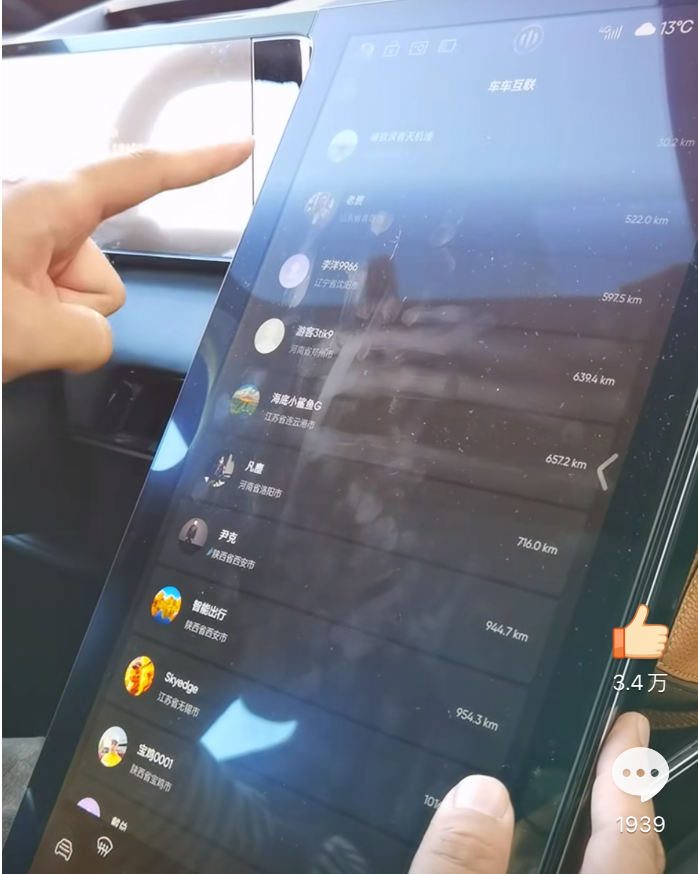 近日,有汽车博主在微博上分享了高合HiPhi X的一个功能:进入车辆自带的行车记录仪,然后点击屏幕上出现的“汽车Wi-Fi”形状的图标,全国范围内同款车型的车主列表就会出现在大屏上。