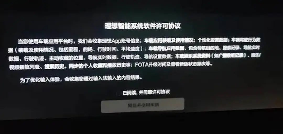 在车辆隐私方面,理想做得更绝。去年9月,一位2020款理想ONE车主向媒体反映称,理想汽车车机更新时出现的“理想智能系统软件许可协议”,只给了同意选项,不同意协议甚至无法继续用车。