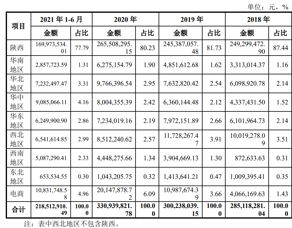 所以招股书提醒道,“如果公司不能有效开发陕西省外新市场,拓宽更广阔的产品市场区域,将对公司未来成长产生一定影响”。