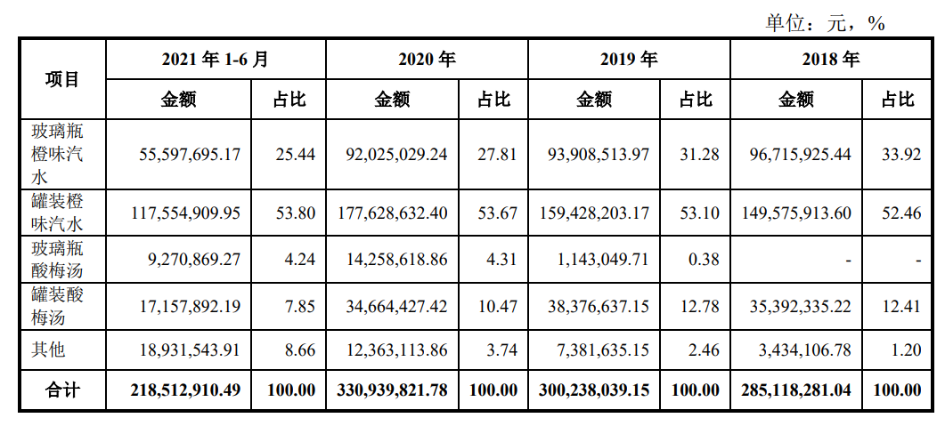 遗憾的是,这些新品未能复制玻璃瓶橙味汽水的辉煌,市场反响平平。如玻璃瓶酸梅汤,2021年上半年只贡献了4.24%的营收,罐装酸梅汤为7.85%,其他产品合计8.66%。
