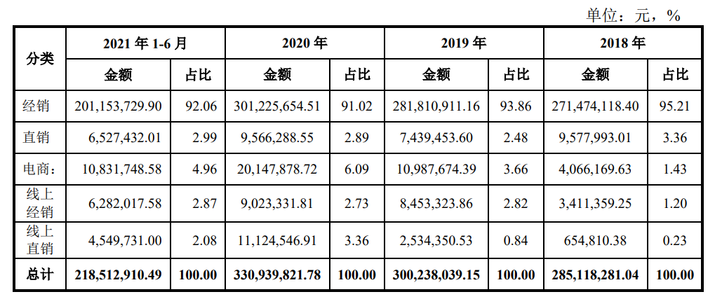 这些销售网络,主要集中在陕西本地。为了突破地域瓶颈,推动产品走向全国,近两年来冰峰饮料开始在电商渠道发力。不过,电商渠道贡献的营收,2020年只有6.09%,2021年上半年只有4.96%。