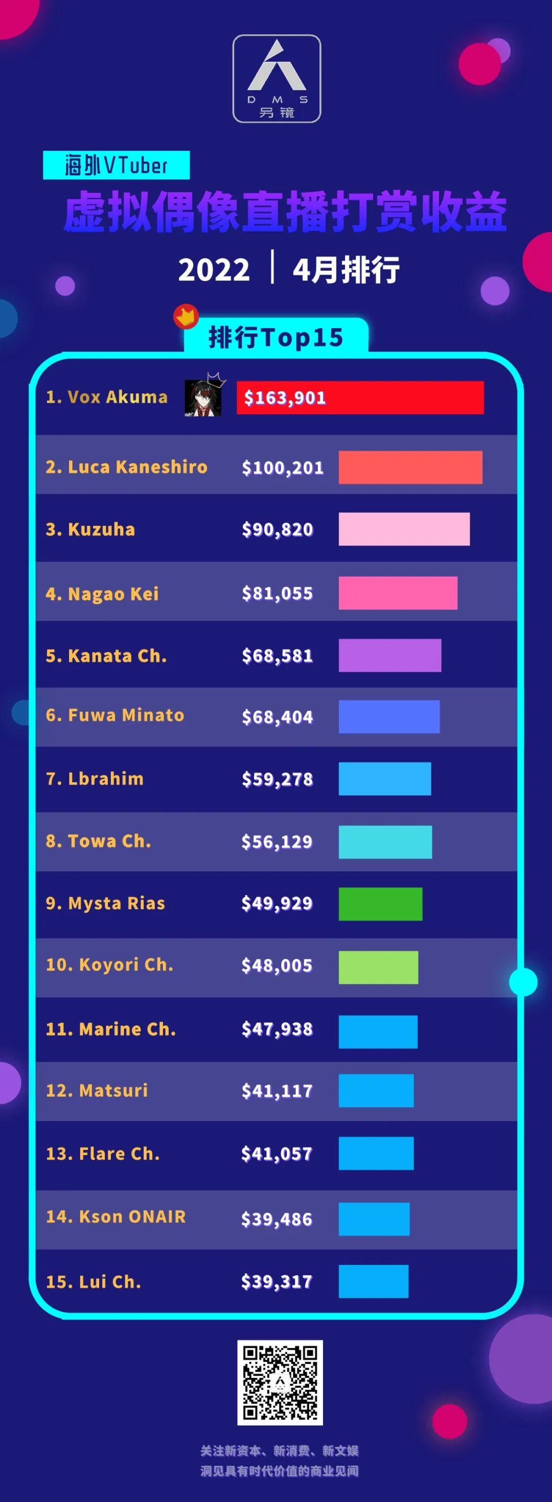 据Playboard数据,在2022年4月YouTuber Superchat收益总榜中,Vox Akuma登上榜首,断层领先。在4月,Vox仅凭借直播聊天(Super Chat)中的打赏,就收获了16.39万美元,折合人民币约111万元,这尚未包括其通过粉丝会员获得的收益。