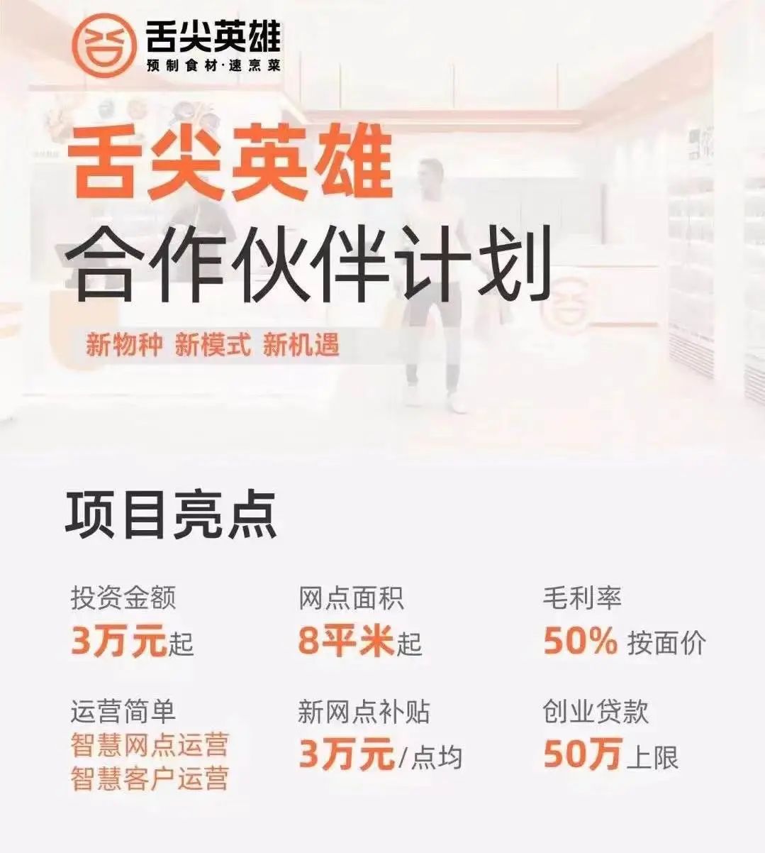 根据舌尖英雄APP里发布的合作伙伴计划来看,目前门店面积在8-60平方米,具体分为三类。其中A类门店最小仅需要8平米,包括店中店和档口店,投资金额3万起;B类标准店在20平方米左右,投资金额5万起;C类门店则包括体验餐厅型、生鲜超市型,面积需要在60平米以上,投资金额11万起。