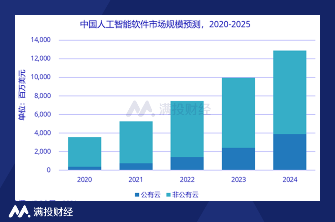 据IDC数据显示,2020年中国AI软件市场规模为231.7亿元人民币,并认为在2024年市场规模有望超750亿元,其中公有云服务占比将达36.1%。基于目前较稳定的云服务各细分市场格局,预计百度在2024年仍将占据AI公有云市场规模的30-35%,即公有云业务位于68亿-75亿元营收区间,考虑私有云增速相对放缓,整体云服务收入约230-260亿元。