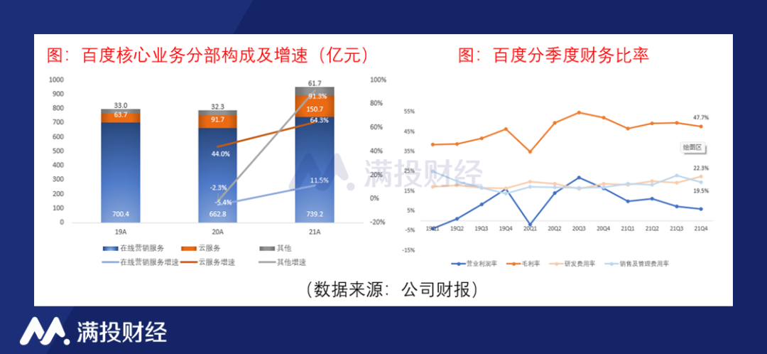 虽然在2021年,百度成功收复“营销”失地,但显然,主营业务的地位正逐渐下降。这归因于互联网广告流量即将见顶、电商与短视频平台不断蚕食广告市场,核心在线营销业务被迫承压,以及创新业务AI云计算服务的增速陡峭。