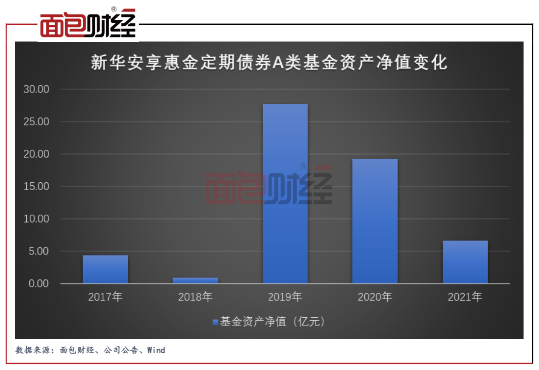 基金成立以来,业绩表现较为出色,新华安享惠金定期债券A类(519160.OF)截至2021年底的基金份额累计净值增长率超过80%。较好业绩表现刺激下,新华安享惠金定期债券A类2019年末的基金资产净值一度超过27亿元。