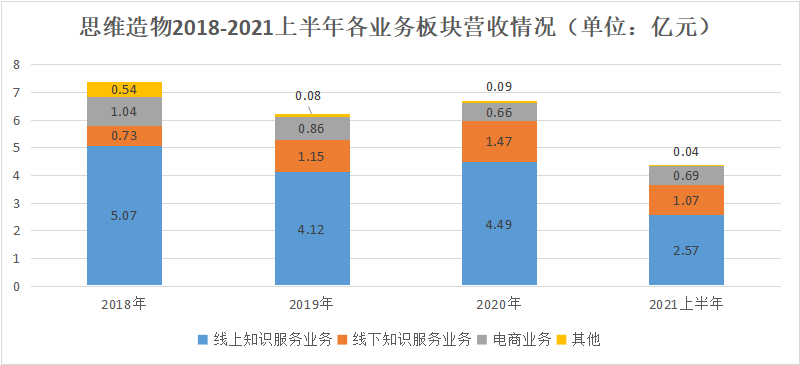 用户规模缩减,思维造物的业绩也随之下滑。招股书显示,2018年-2020年,思维造物的营收分别为7.38亿元、6.28亿元、6.75亿元,近三年复合增长率为负。拆分来看,公司的业务主要包括线上知识服务业务、线下知识服务业务、电商业务及其他。和2018年相比,除了线下知识服务业务收入有所上升,其他三个业务板块的收入均有所下降。其中,作为营收主力军的线上知识服务业务,2020年收入4.49亿元,与2018年相比下降11.44%,占总营收的比例也从68.74%下降至66.89%。这和付费用户规模的下降不无关系。