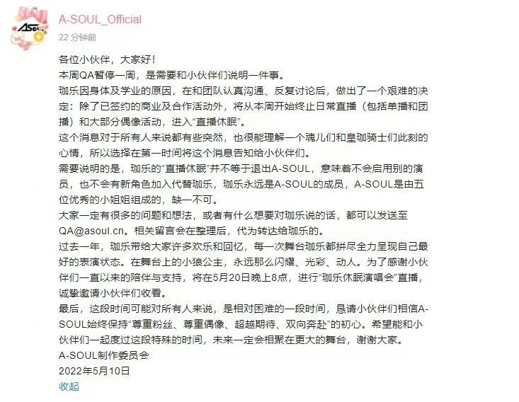 除去成本,在行业规则尚不明朗的环境下,虚拟人背后的运营乱象丛生。官方为了吸睛强拉CP,中之人的薪资与行业地位不符,工作环境的恶劣等,使得虚拟人迟迟没能得到更大发展,这从5月10日A-SOUL主唱珈乐宣布“休眠”便可见一斑。