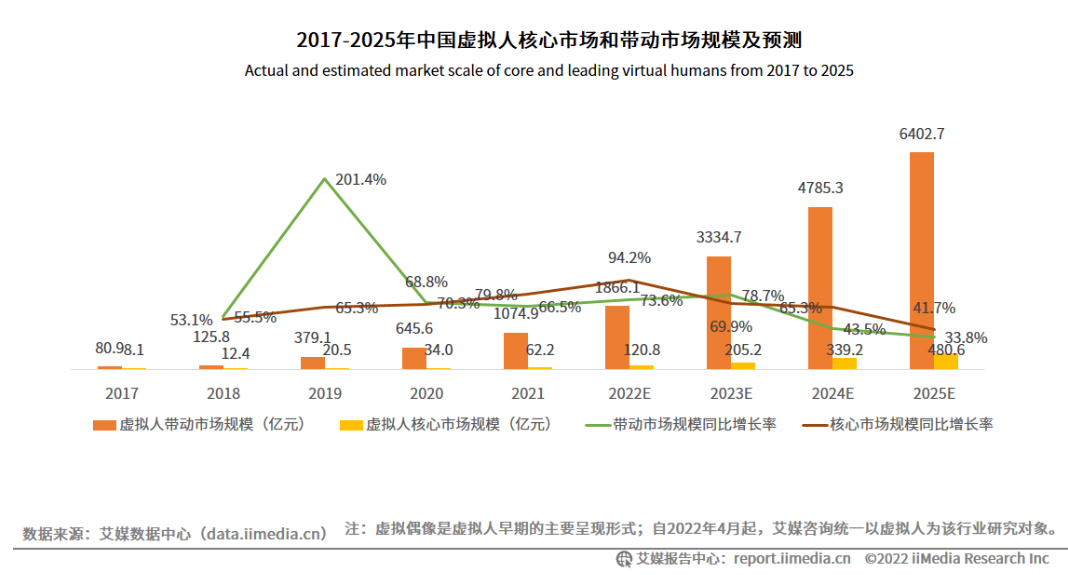 虚拟人帮助平台获得了大波粉丝流量,流量的转换为背后的制作公司带来巨大利润,这使得虚拟人行业获得资本热捧,而资本的入场直接带来了虚拟人市场规模的增长。从不久前发布的《2022年中国虚拟人产业商业化研究报告》来看,2021年中国虚拟人带动产业市场规模和核心市场规模,分别为1074.9亿元和62.2亿元,预计2025年分别达到6402.7亿元和480.6亿元,增长态势强劲。