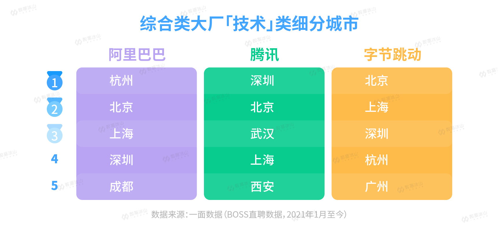 从城市来看,三家大厂还是重点布局北上广深杭,成都紧随其后。