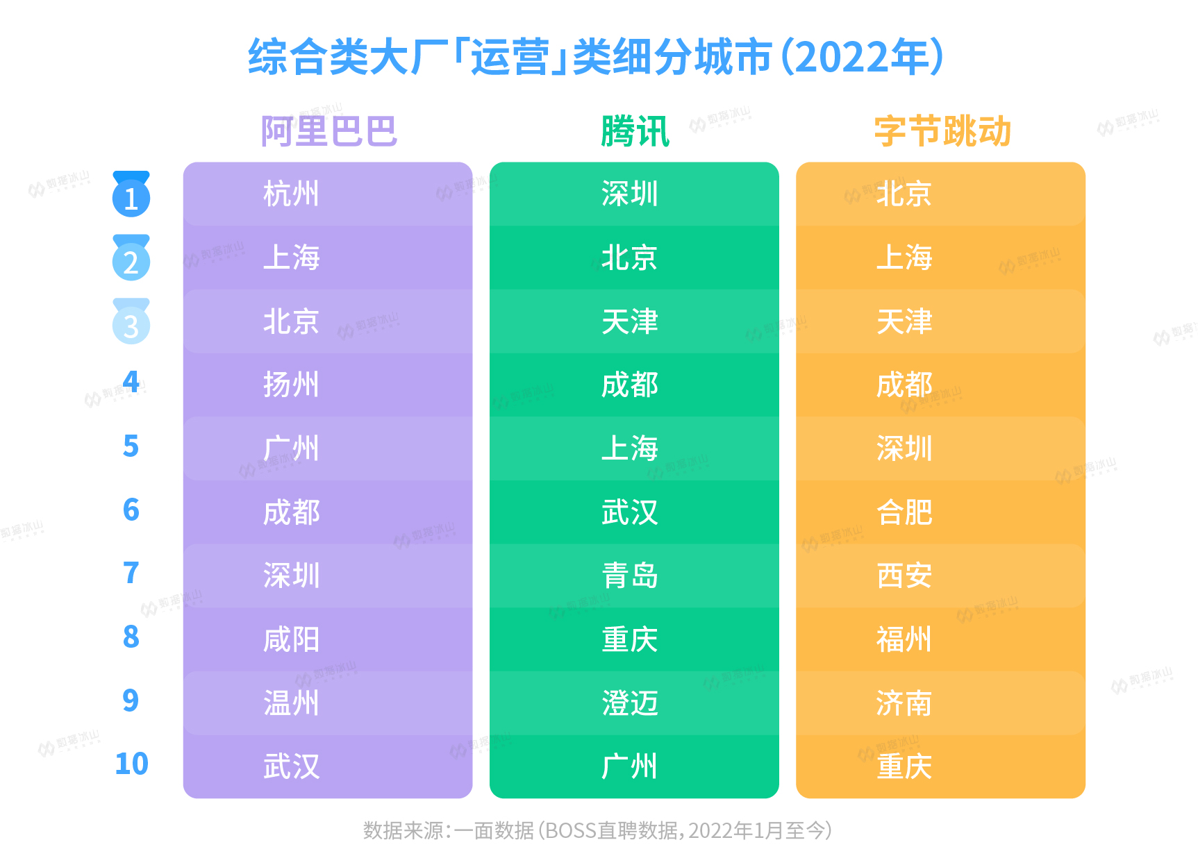 从城市来看,运营类岗位的分布非常分散,天津、扬州、成都、武汉、合肥等城市备受重视。腾讯的排行榜中有一个比较陌生的城市「澄迈」,实际上是腾讯在海南的澄迈建立了腾讯生态村。事实上字节跳动也正在布局澄迈的职位。