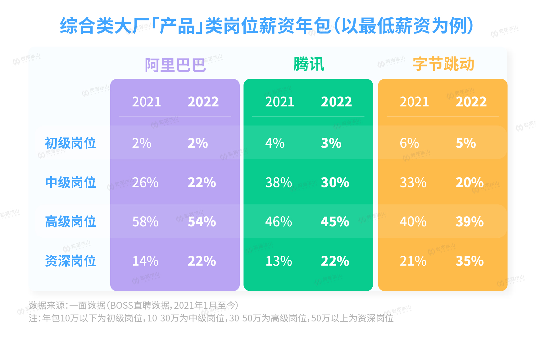 再来看「产品」类岗位。可以发现,从薪资结构来看,三家大厂往资深岗位的流动非常显著,再一次证明了资深产品经理的重要性。