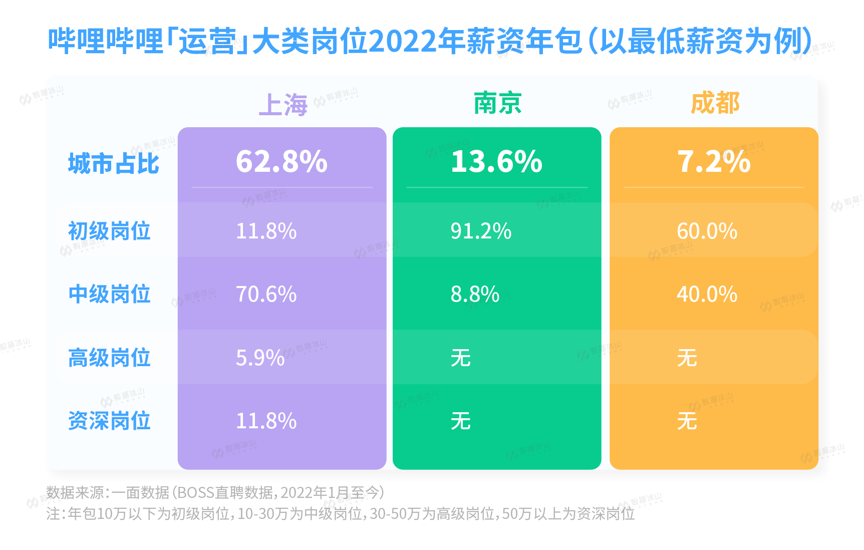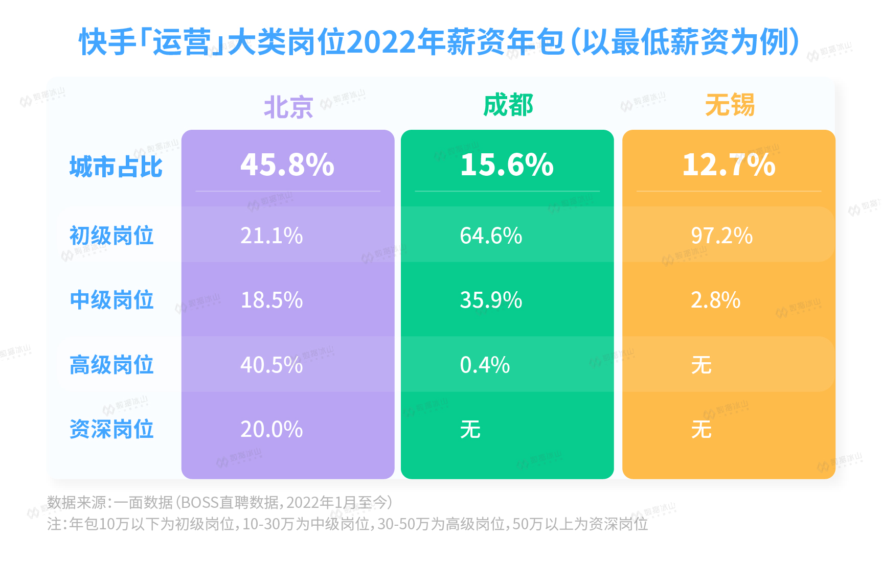 最后再来看看「运营」大类岗位所在城市。除了总部所在城市之外,基本都选择了新一线城市乃至二线城市,悄然转移人力成本。