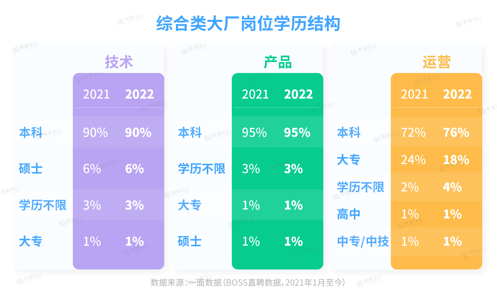 值得一提的是,从学历结构来看,「运营」类岗位相较「技术」和「产品」类岗位,也更容易敲开大厂的大门。