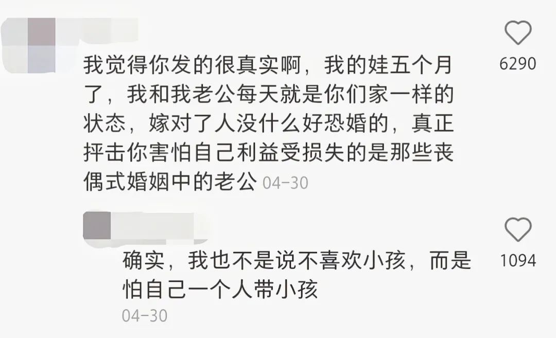 根据怨种爸爸和薯条爸爸的粉丝画像,其粉丝绝大多数都是25岁以下的年轻女性;而在“淦淦惹”的评论区里,“要是以后我找的另一半像你一样,我也不会这么恐慌”、“孩子真的好可爱”等句意相近的评论高频出现,足以体现一定的缓和功效。