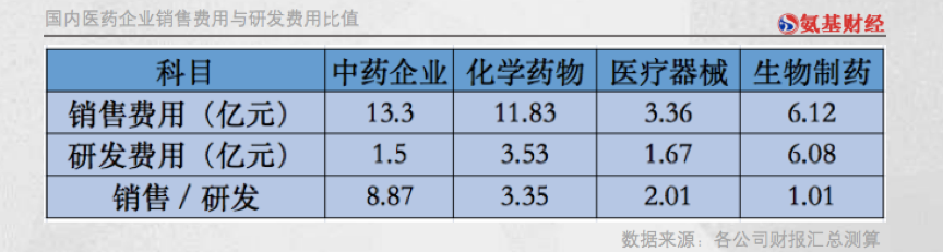 相比之下,化药和中药领域的企业,显然对于营销的依赖是要多于研发的。
