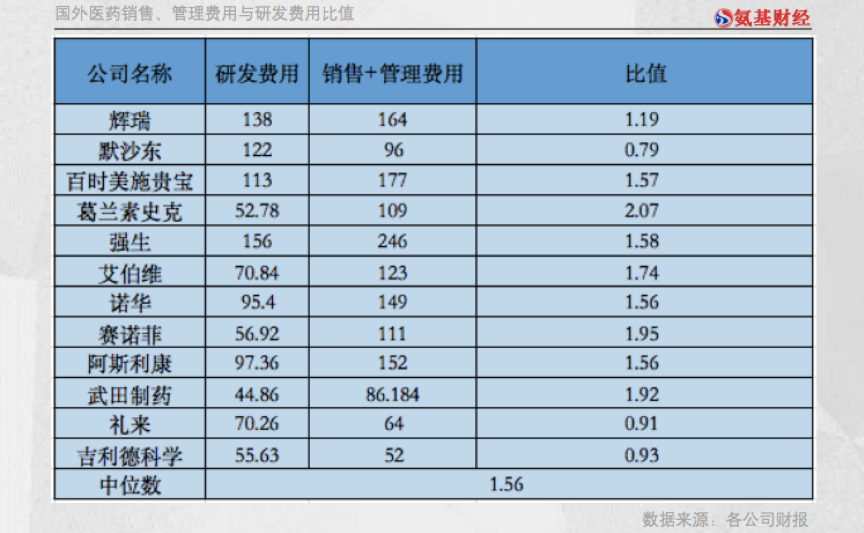 事实上,海外药企巨头,一直都是研发(并购)+销售双轮驱动:运营费用(销售费用+管理费用)与研发费用比值的中位数为1.56,如果单独考虑销售费用,那么其与研发费用的比值将更低。