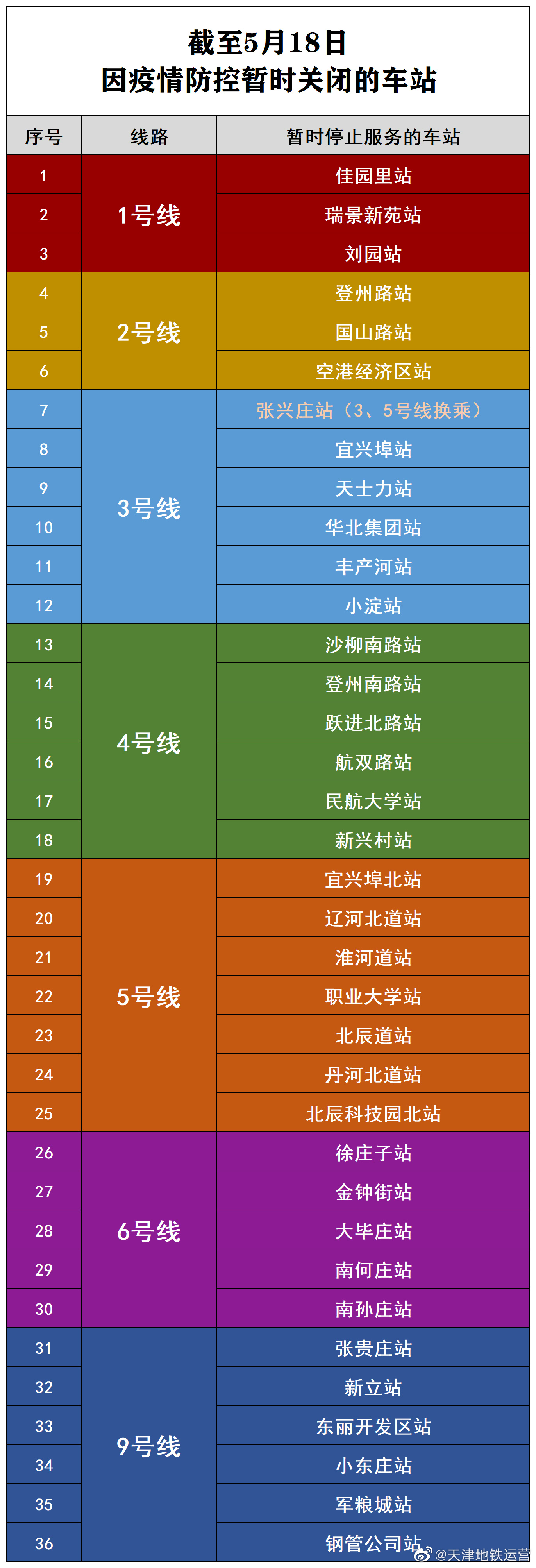 @天津地铁运营 微博18日消息,根据疫情防控需要,天津地铁1号线佳园里、瑞景新苑、刘园;2号线登州路、国山路、空港经济区;3号线宜兴埠、天士力、华北集团、张兴庄;4号线沙柳南路、登州南路、跃进北路、航双路、民航大学、新兴村;5号线张兴庄、宜兴埠北、辽河北道、淮河道;9号线张贵庄、新立、东丽开发区、小东庄、钢管公司等站临时关闭。