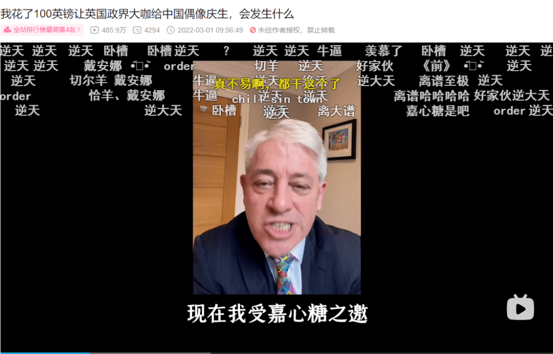 在今年3月6日的虚拟偶像“嘉然”生日会,一位粉丝在B站上传了一段英国下议院前议长约翰·伯考为嘉然送祝福、唱生日歌的视频,收获了480万次播放。
