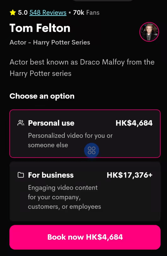 比如作为平台上最受欢迎的“明星”之一,约翰·伯考的个人祝福视频收费折合人民币为701元。而曾在《哈利波特》系列中饰演马尔福的演员汤姆·费尔顿,在Cameo上有7万粉丝,个人祝福视频收费约合3786人民币。