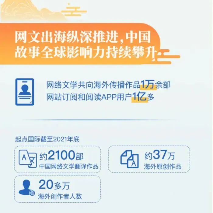 出海模式的转化体现在网文从作品授权的内容输出,提升到了产业输出模式,实现了网文创作生产的跨域际转化。以向海外读者提供优质网文为宗旨的“起点国际”于2017年5月上线,实现了网文外译规模化,且具有原创功能。截至2021年底,起点国际上线约2100部中国网络文学的翻译作品,培育海外原创作品约37万部。该平台吸引和培育了20多万名海外创作者,真正实现了网文原创出海。