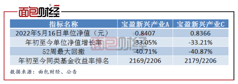 作为宝盈旗下规模最大的主动权益类产品,宝盈新兴产业今年的业绩表现却并不理想。2022年初至今(截至5月16日,下同),宝盈新兴产业A单位净值下跌33.05%,单位净值跌至0.84元。单位净值跌幅不仅是宝盈旗下所有基金产品中跌幅最大的,并且在同类基金中也排在尾部。