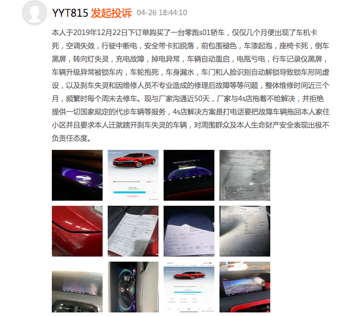 当然,电池包的问题可能短时间内尚看不到影响,但其他车型的质量问题却已经藏不住了。一位购买了2019款零跑S01的车主在网络投诉平台上表示,新车上路刚刚几个月后,车辆就出现车机卡死、空调失效、行驶中断电、充电故障、车身漏水等等问题,整体维修时间近3个月,频繁时甚至每个周末都要去修车,厂家与4S店却始终未能拿出令消费者满意的解决方案。