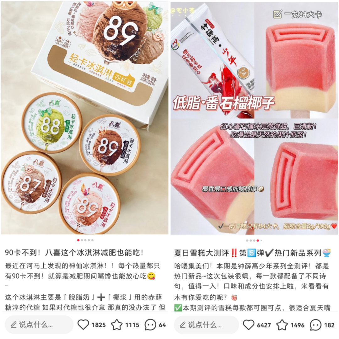 近两年食品饮料的减糖、低脂趋势依然有增无减,注重健康的消费者们除了“谈糖色变”,对食物热量、营养要素构成也更加严格选择。小红书平台中,不少冰淇淋/雪糕测评以低卡、控糖、不含反式脂肪酸为主题,还用指标给各种产品进行高低排序,一目了然。