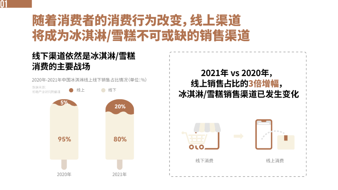 冰淇淋/雪糕的销售渠道正从线下走向线上,国内不少冰品品牌在布局线上渠道,希望以此实现全季节销售,提振消费淡季。在电商和直播带货的带动下,冰淇淋/雪糕的线上销售占比在近两年间翻了4倍,从2020年之前的5%增长至2021年的20%。