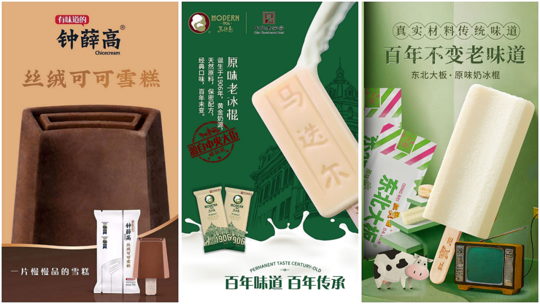 钟薛高、马迭尔、东北大板被视作国产冰淇淋代表;图片来源:钟薛高、马迭尔、东北大板