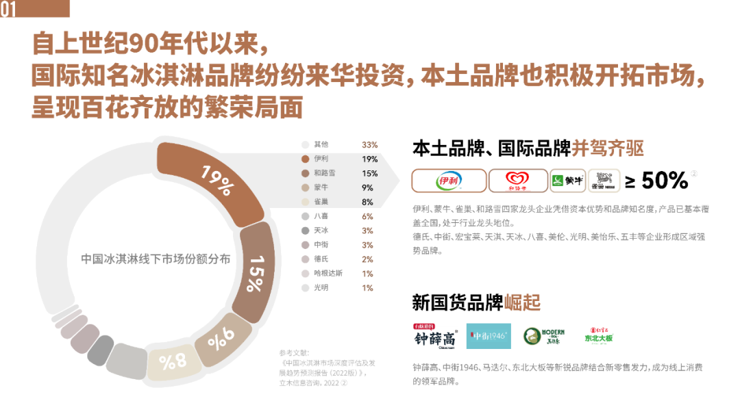 现在的中国冰淇淋市场已呈现本土品牌、国际品牌平分天下的局面,这为国内外新晋品牌提供了有利环境,国产中高端冰淇淋品牌的涌现,也在促进消费者对国产冰淇淋的认可和支持。