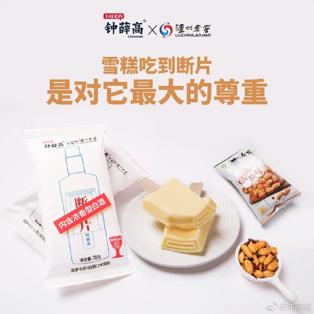 早在2019年,钟薛高就与泸州老窖联名,首次推出“断片”系列,雪糕以浓香型白酒为芯,通过特殊技术注入并保持流心口感,外层则用牛乳搭配菲律宾MD2金菠萝树熟果。