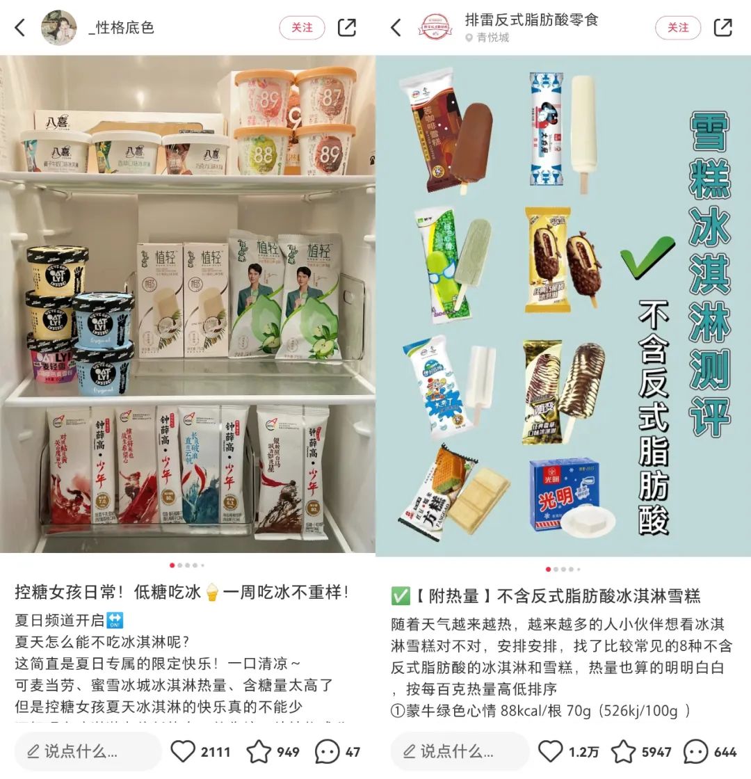 对低糖冰淇淋、不含反式脂肪酸冰淇淋的网络测评;图片来源:小红书@_性格底色、@排雷反式脂肪酸零食