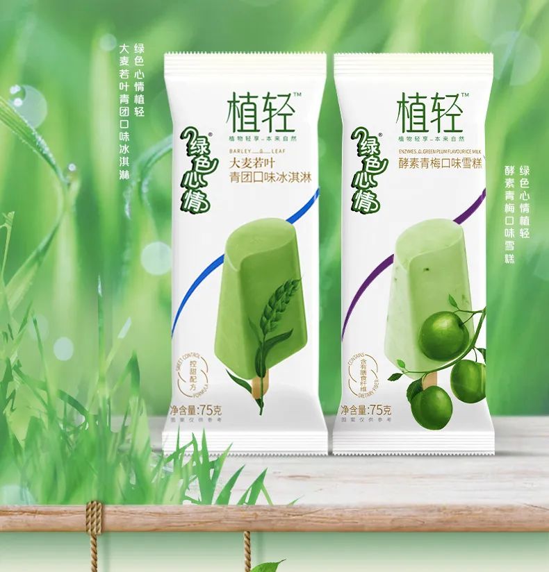 近几年,蒙牛的冰淇淋业务专注于品牌重塑和产品升级。旗下品牌“绿色心情”,在2021年开始了品牌转型,通过突破豆冰品类,开拓植物草本冰淇淋赛道,并孵化“植轻”子品牌,用自然、草本等关键词加强品牌理念沟通。