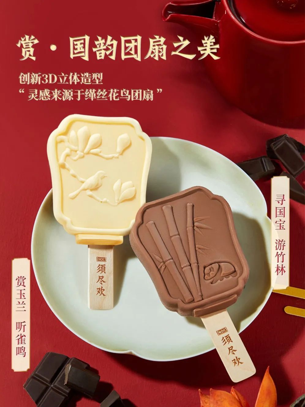 今年3月,伊利旗下“NOC须尽欢”官宣新品须尽欢3D团扇鲜牛奶冰淇淋,在品牌原有国潮风概念上做了次升级,两款新品口味纯牛乳酪酪、醇榛浓巧巧,均添加了3.8倍蛋白厚乳。