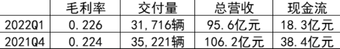 再来看理想的一季度财报,不出所料各方面指数都下滑了。除了勉强保持的毛利率,不管是交付量,还是总营收,又或者是现金流,都比不上去年4季度。