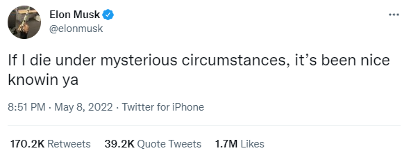 大手笔买下通往WEB3康庄大道的Twitter这才没过去几天,埃隆·马斯克在5月8日的Twitter个人页面上发文说,如果自己神秘死亡,“很高兴认识你”。