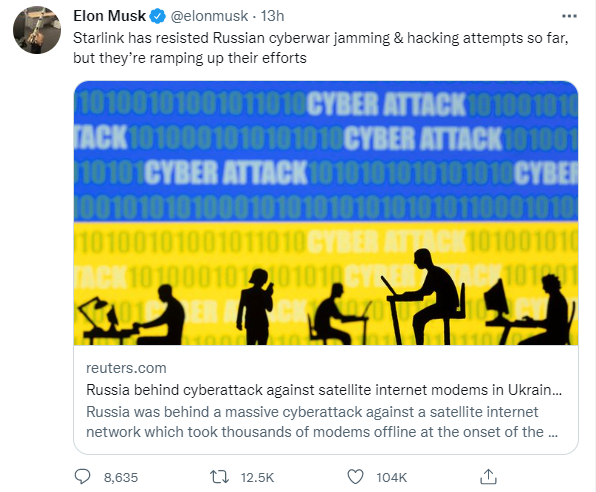 “到目前为止,Starlink(星链,SpaceX计划推出的一项通过近地轨道卫星群)一直在抵制俄罗斯的网络战干扰和黑客攻击,但他们正在加紧努力中。”