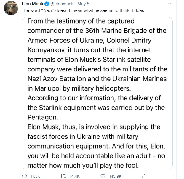 “没人需要你,别胡闹。今天是我们国家庆祝伟大节日——战胜法西斯主义的日子。遗憾的是,在你向乌克兰纳粹分子提供军事通信卫星后,我无法就这一节日向你表达祝贺。埃隆,请想想,你站在哪一边。”