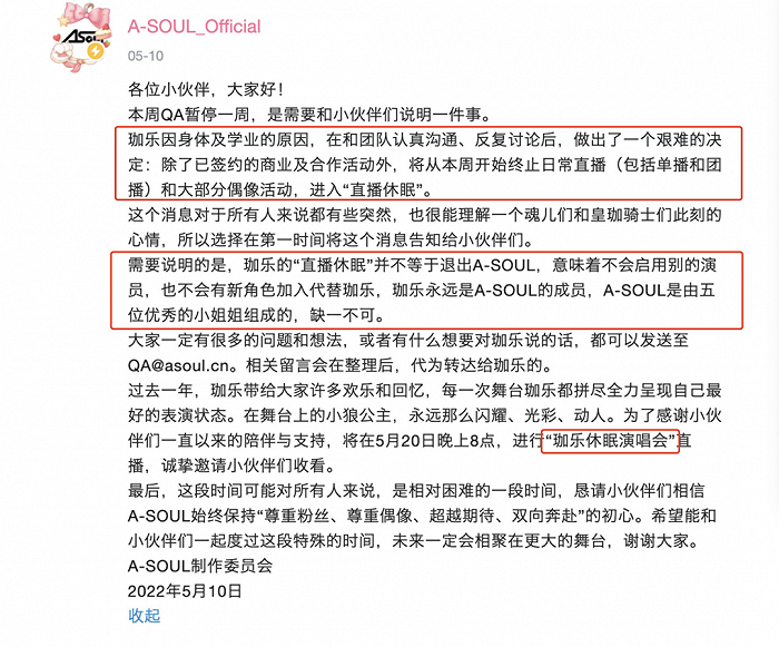 没想到,5月10日,A-SOUL的B站官方账号宣布:“珈乐”进入“直播休眠”。在官方的表态中,“珈乐”的“直播休眠”不等于退出A-SOUL,同时,不会启用别的演员,也不会有新角色加入代替珈乐。