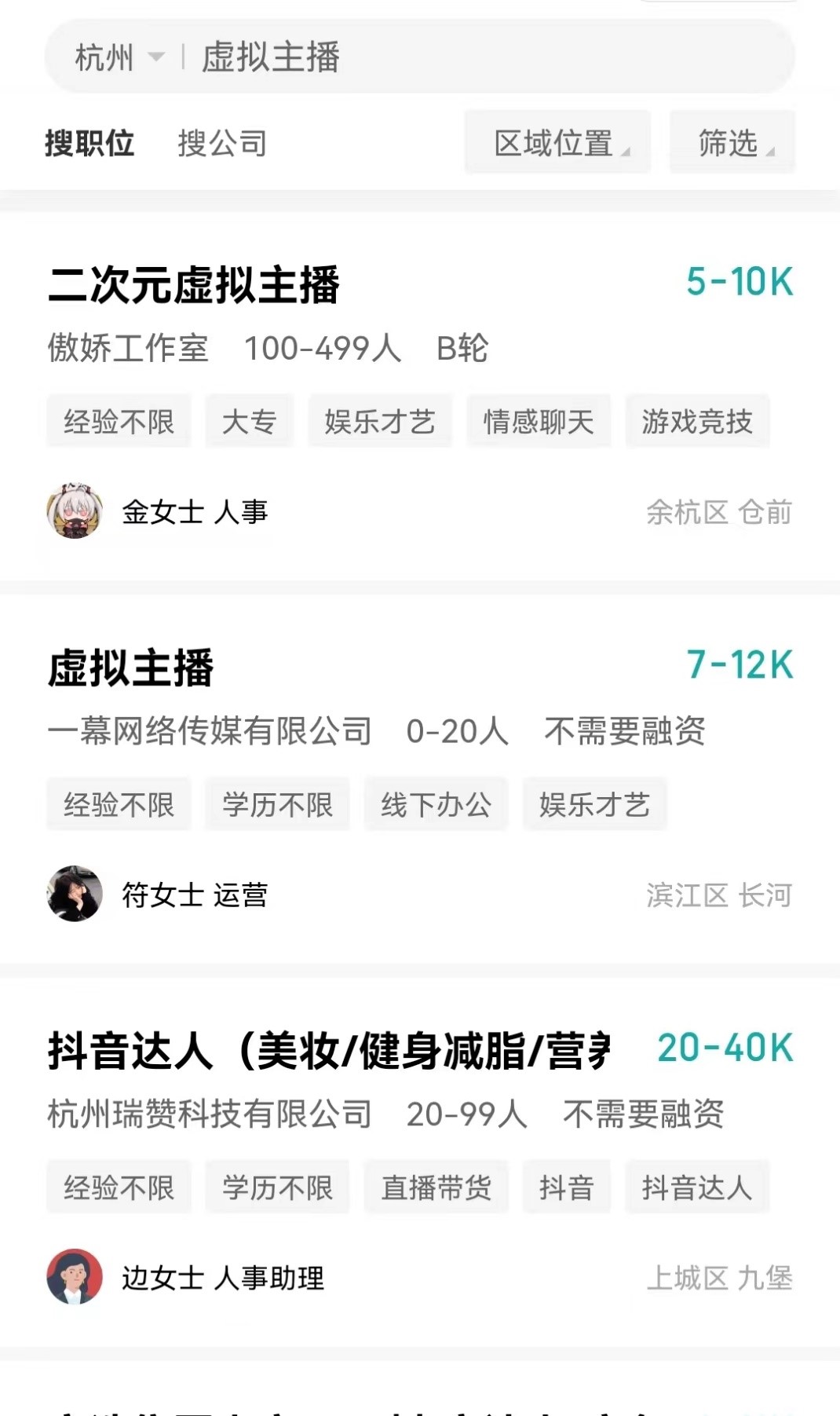 在Boss直聘平台搜索“虚拟主播”,薪资大部分在每月5000元到12000元之间,与主播薪资对比强烈。