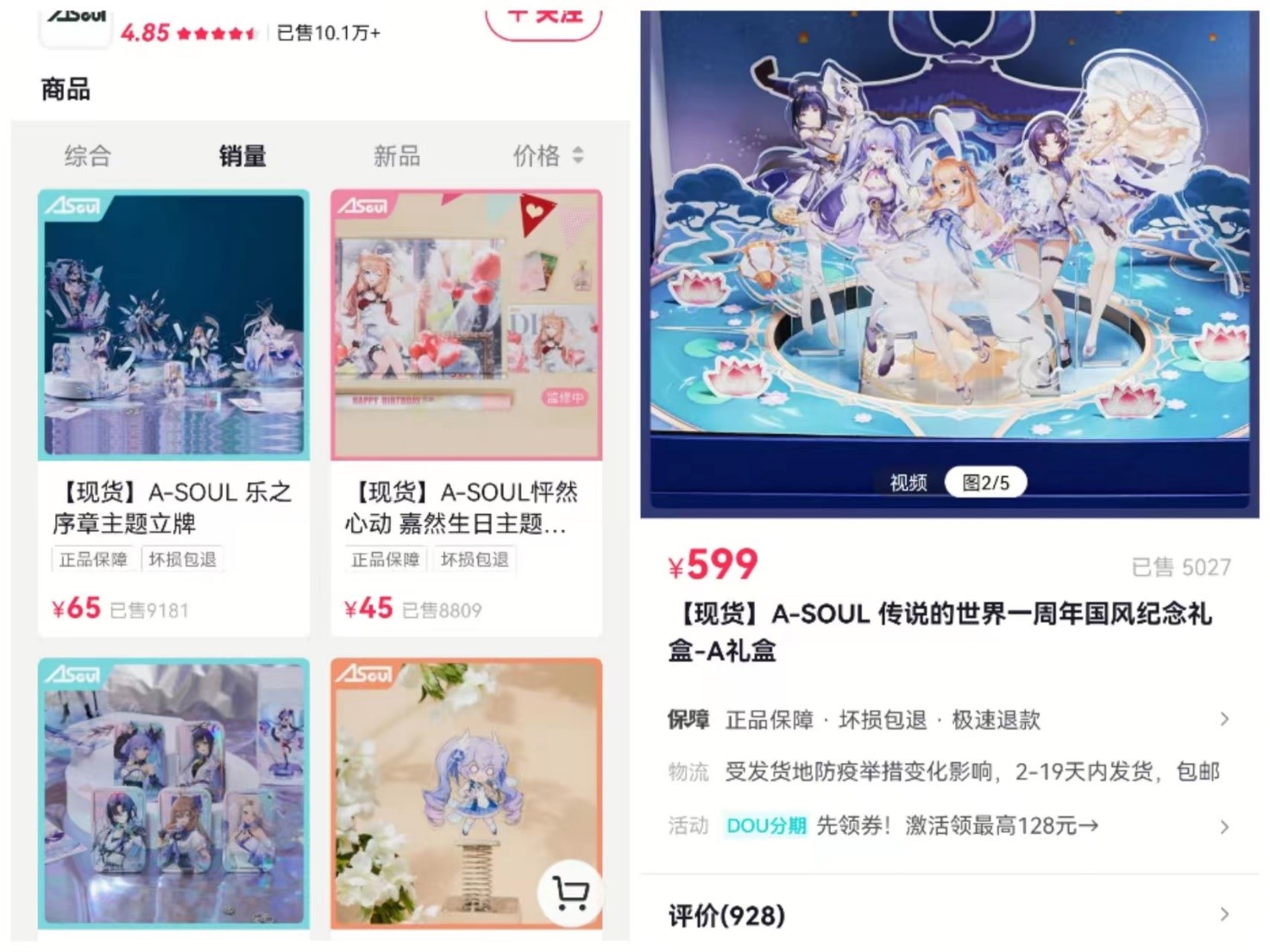 直播打赏之外,A-SOUL的周边商品销量堪称惊人。A-SOUL官方抖音小店显示:售卖总量已超10万件,其中售价599元的周年纪念礼盒卖出5027件,收入超300万元。